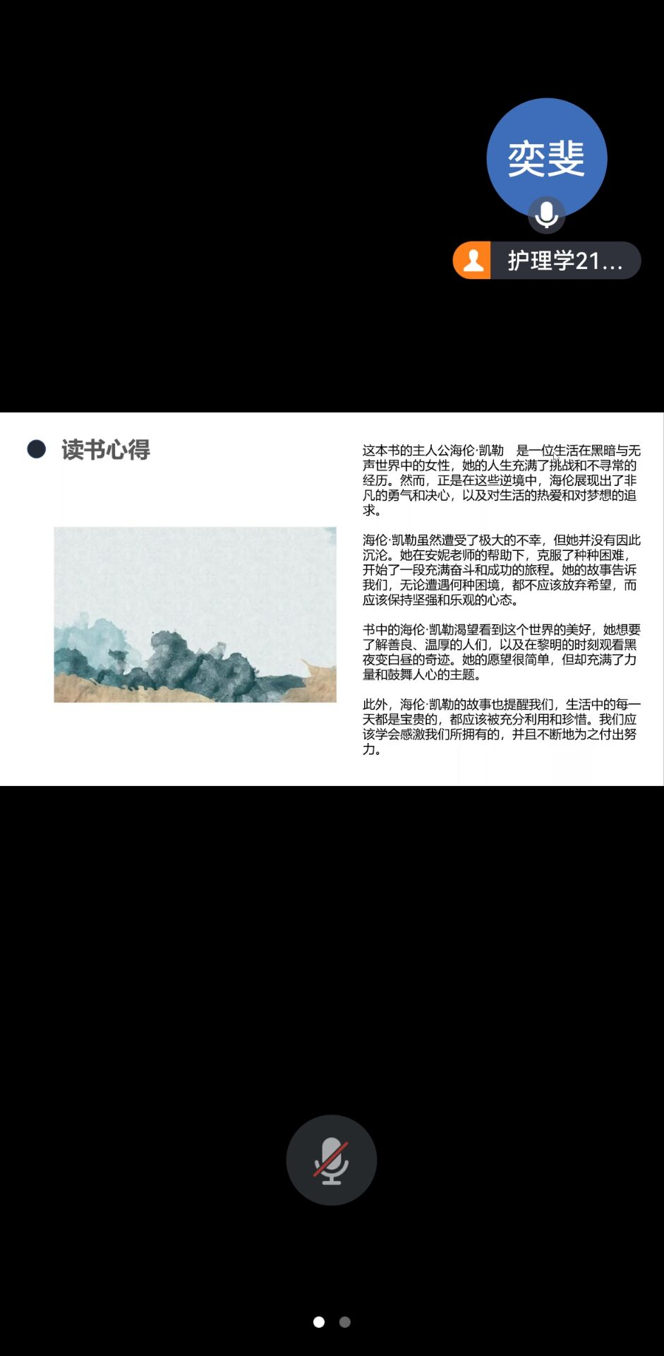 刘奕斐同学本次读书分享的是《假如给我三天光明》,海伦·凯勒的故事告诉我们,无论遭遇何种困境,都不应该放弃希望,而应该保持坚强和乐观的心态。此外,海伦·凯勒的故事也提醒我们,生活中的每一天都是宝贵的,都应该被充分利用和珍惜。我们应该学会感激我们所拥有的,并且不断地为之付出努力。