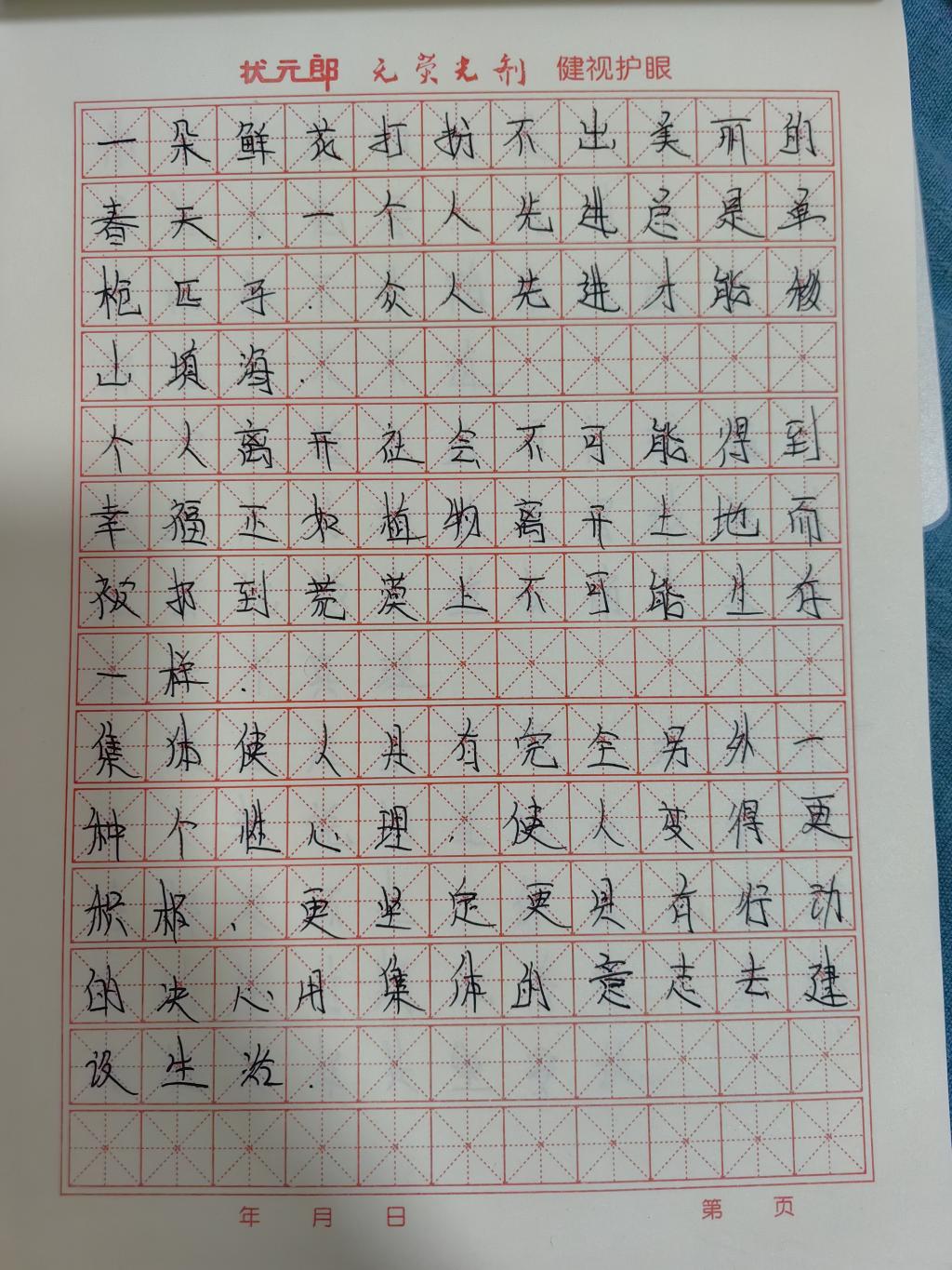 本周小组成员继续书写字帖临摹,阅读经典著作凝练、总结形成读书感悟。小组成员与母校老师取得联系,确定母校回访开展时间与内容。志愿服务方面,成员结合专业特点从敬老救助、恤病助残、健康指导等方面中选择一项展开服务。选修方面,小组成员选择音乐鉴赏居家劳动感恩父母等,提高自己的五小能力,体现大学生学会感恩回报社会。