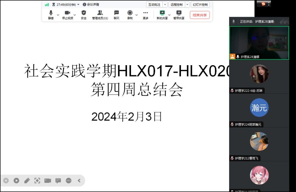 为了更好指导HLX17-HLX20组学生完成第四学期并学有所获,2月3日晚,生涯导师潘娜采用腾讯会议召开第四学期第四周周小结,健康与护理系HLX17-HLX20组成员共同参加。
