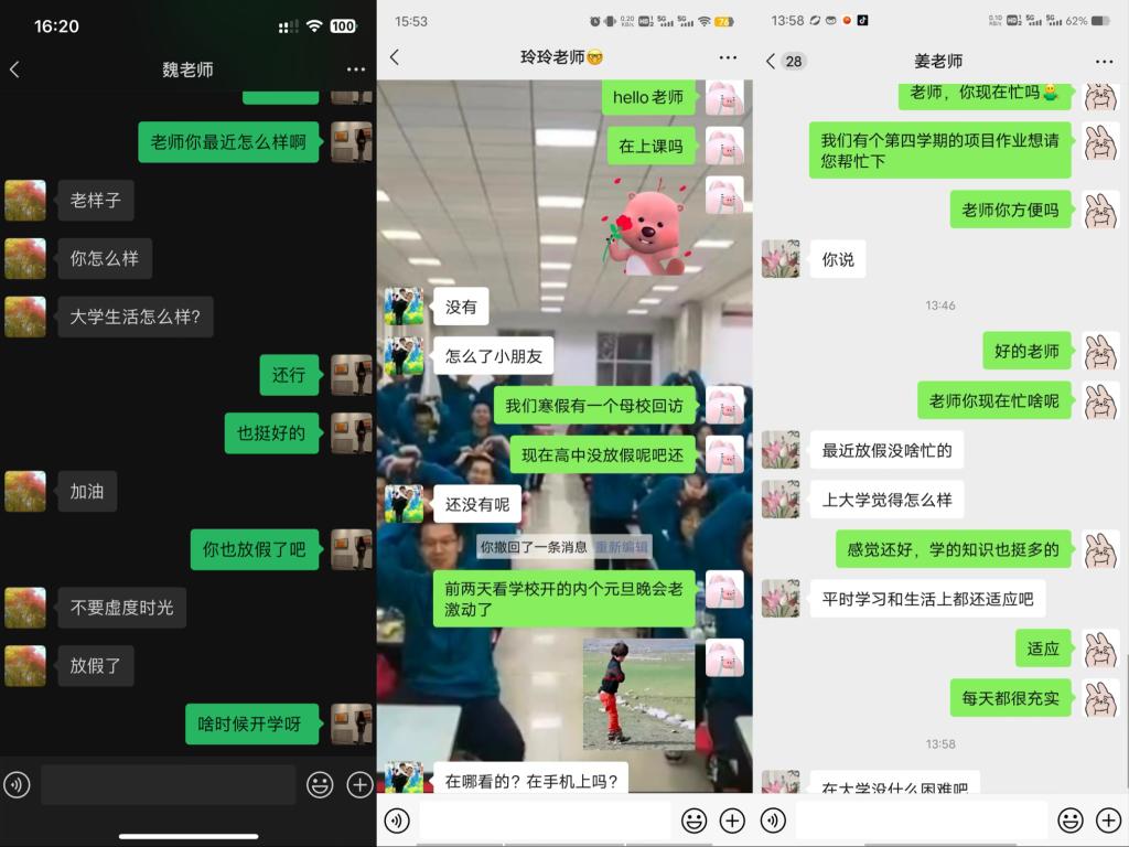 老师为我们接下来的道路指点了迷津,给了我鼓励和信心。我们一起谈论上学时的趣事和怎么都回答不出的题目。老师还给我展示了母校,还有学弟学妹们奋笔疾书的照片,我们也给老师看了我大学校园的美丽景色,还有我们丰富的社团活动,实验器材等。同时,作为高考的亲历者,我们也愿意将我当时备考时容易走进的误区向老师进行了阐述,如果可以将部分经验分享给母校的学弟学妹,在协助他们的同时,也能丰富实践活动的意义。