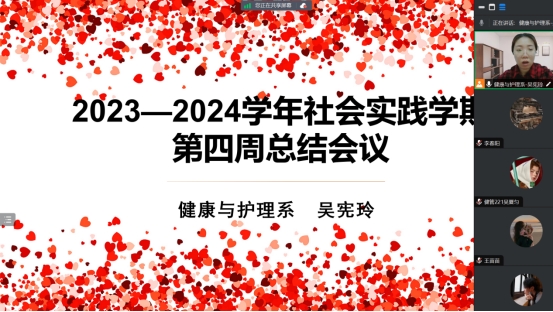 为了更好地推进社会实践学期,2024年2月2日下午19:00吴宪玲老师在腾讯会议召开了2023-2024学年社会实践学期第四周总结会议。本次会议由健康与护理系吴宪玲老师主持,生涯小组全体同学参会。