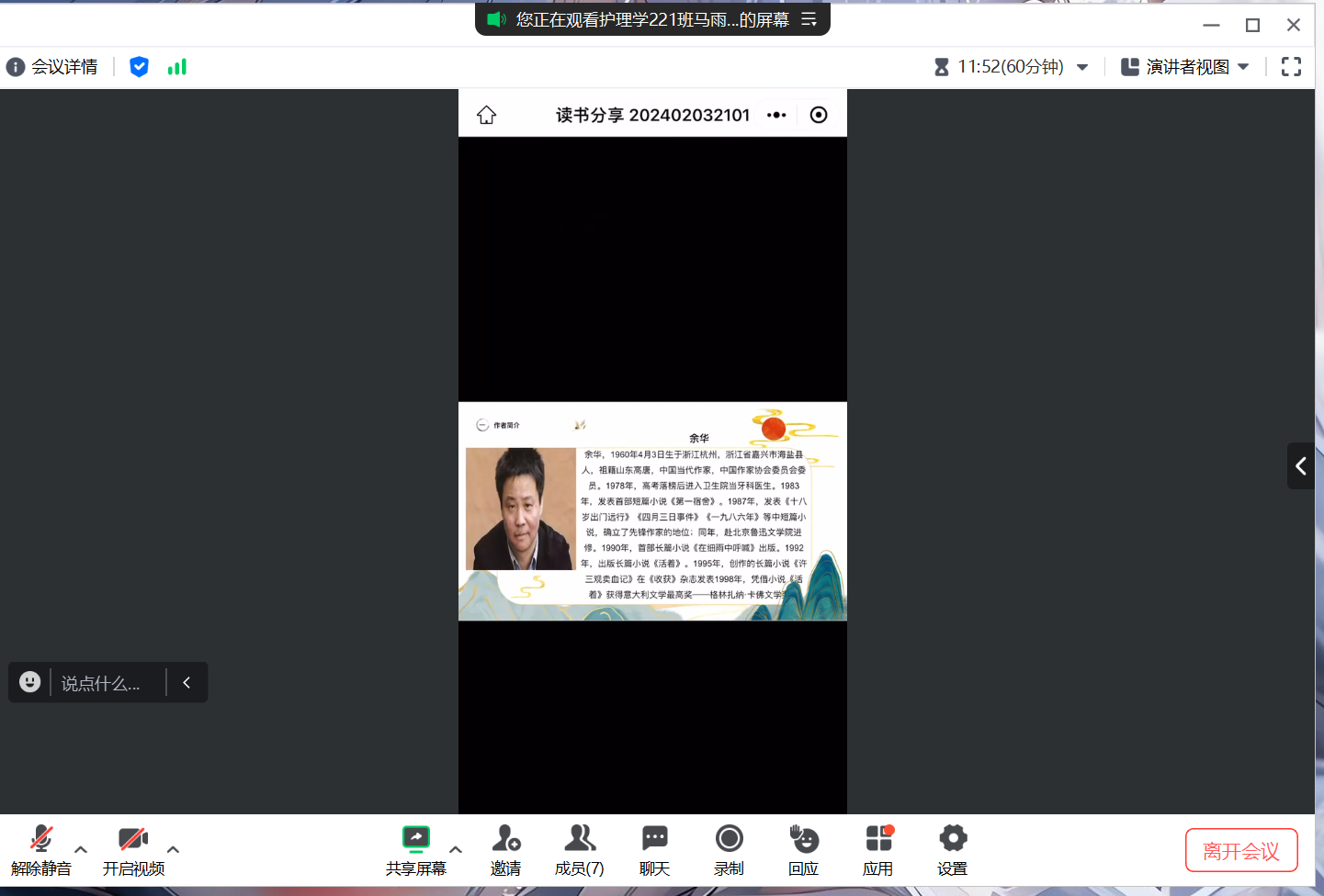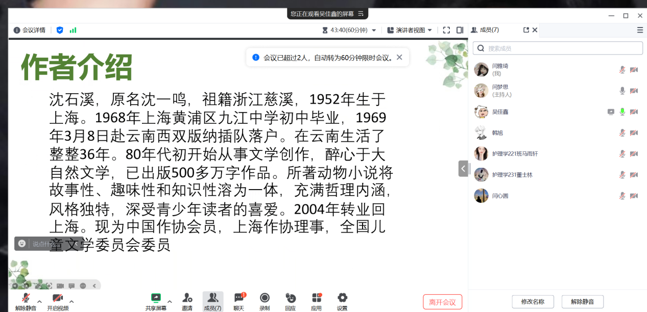 此次进行读书交流的有闫雅琦同学、吴佳鑫同学,闫心圆同学、韩旭同学、董士林同学、马雨轩同学。他们从作者经历、故事简介、读后感悟三个部分进行PPT分享。