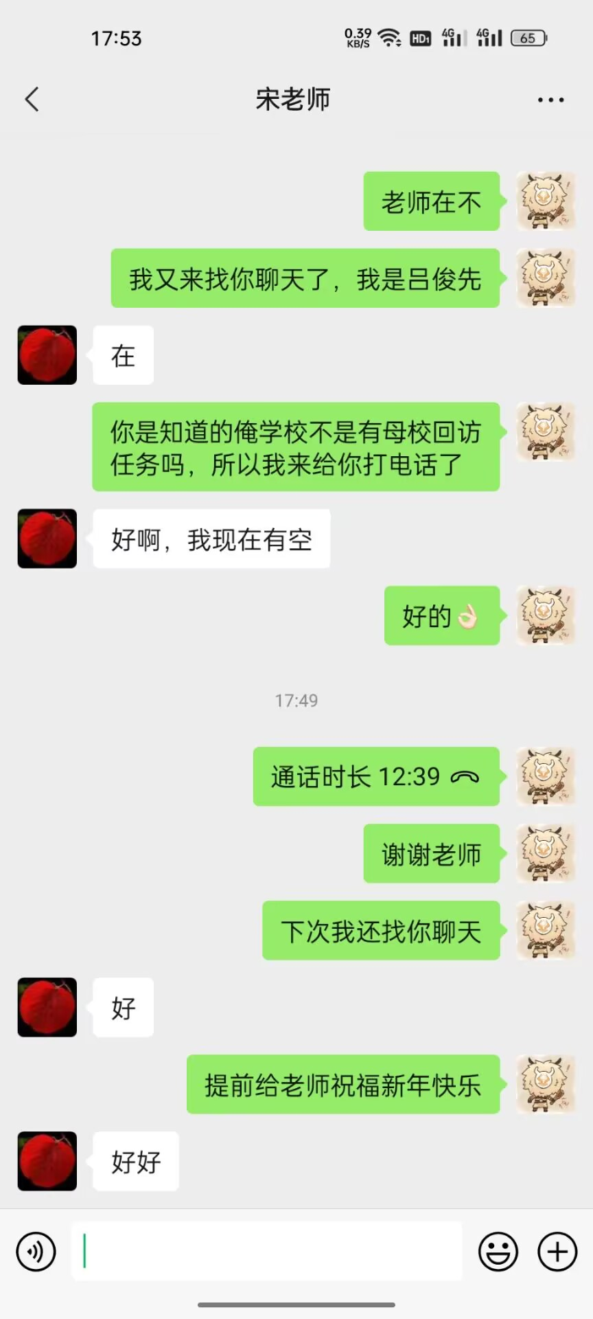 母校不仅是一种精神上的寄托,还承载着学生的记忆、情感以及对学校的归属感和认同感。为了积极响应社会实践学期“母校回访”活动HLX-043组吕俊先于2024年2月3号进行母校回访。 首先吕俊先通过微信与老师取得联系,然后打微信电话与老师进一步的交流,在交谈中吕俊先询问近来老师的身体状况,介绍大学的校园生活,以及向学弟学妹们传达在大学如何有效的学习。 最后祝愿母校光辉历程更辉煌,人才辈出代代强,桃李满天扬四海。