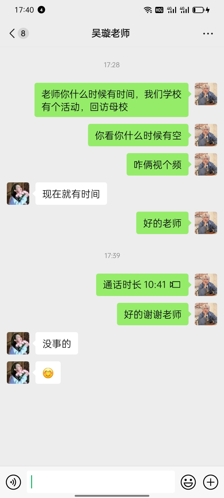 通过这次活动,我再次通过手机屏幕见到了我的老师,老师依然那么关心我的学习情况,也让我感觉到初中时候的每天,我跟老师分享了一下我的大学生活,到了最后时候,老师嘱咐我在大学要好好学习,朝着自己的目标越来越近,感谢老师的祝福。通过母校回访的活动,跟老师聊了这些都让我受益终身。