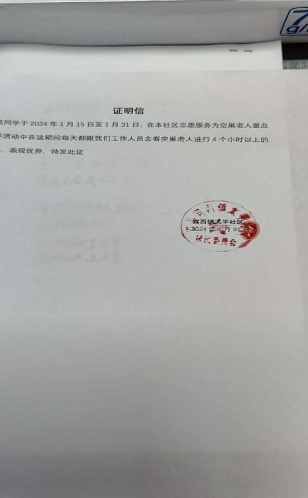 为了大学生能体现出关爱老人、尊重老人,张昊同学于2024年1月31日特此联系当地的社区去帮助一些空巢老人进行血压测量。