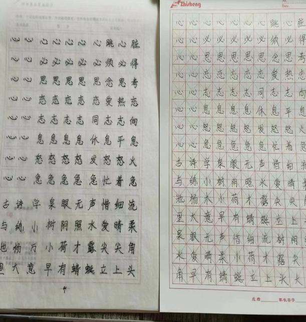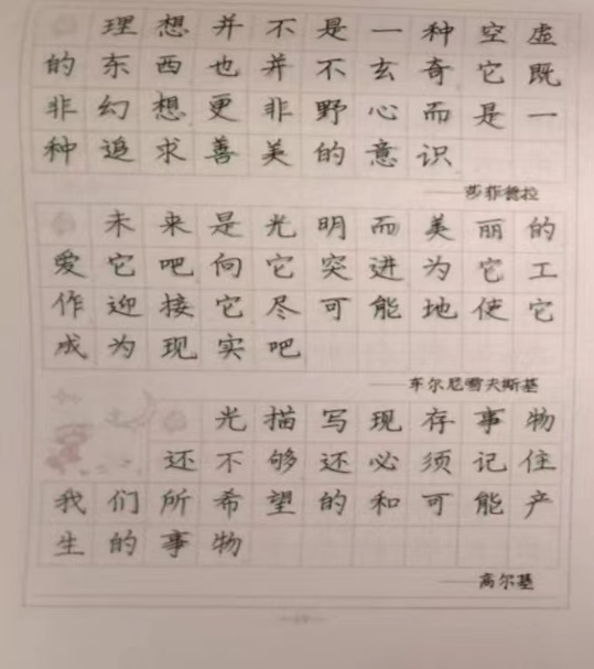 小组成员每天都坚持完成字帖临摹的任务,临摹字帖需要长时间的集中注意力和动手实践,需要不断坚持和重复。小组成员都可以在每天的练习中做到专心致志,心无旁骛。