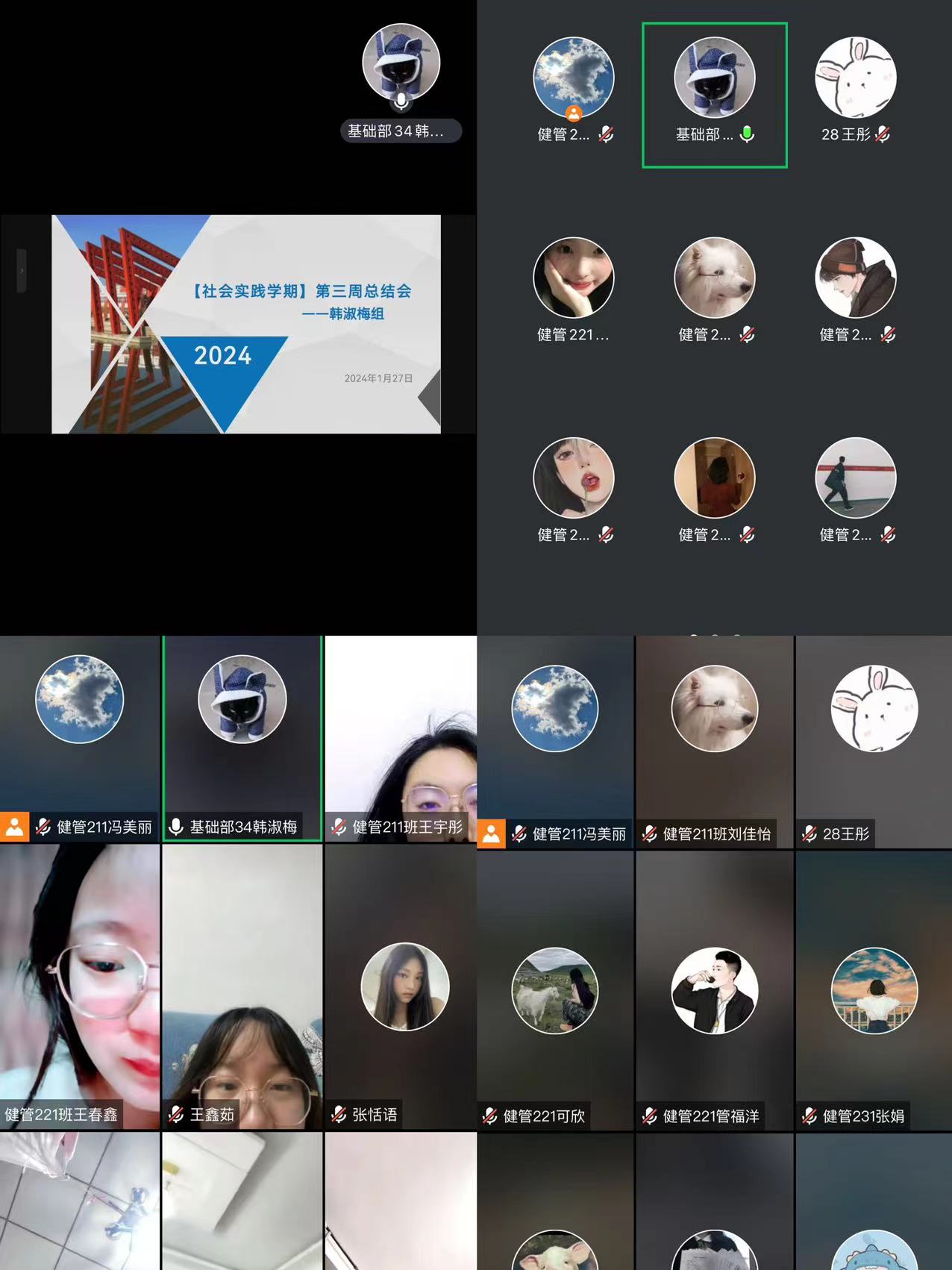 2024年1月27日19:00韩淑梅老师通过腾讯会议线上组织召开了社会实践学期第三周总结会议。