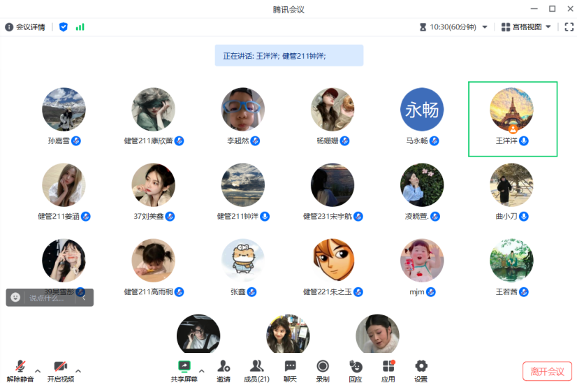 2024年1月29日生涯导师王洋洋老师开展了线上社会实践学期中期总结会议,健管211班、健管221班和健管231班总计21人参加。本周是社会实践学期的中期总结会议,各组先在完成自己任务基础上进行汇报,王洋洋老师总结各组优缺点并提醒注意事项。