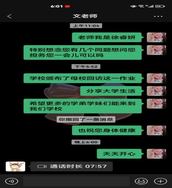 2024年1月15日,徐睿妍同学进行了母校回访活动,因为老师已去南方过年,所以本此活动以线上的形式开展。徐睿妍向老师介绍了大学美好的生活,有趣的舍友,可爱的同学们,美丽的环境,良好的学习氛围,还有设施,例如图书馆,二食堂、三食堂、三味食堂等较为关注的内容。同时,也向老师介绍了这两年的成长,大学需要独立思考,应对各种问题,除了专业知识,自己的人际关系处理能力,沟通能力也都有所提升。文老师很欣慰学生的成长与变化,也向徐睿妍同学介绍了高中的变化,介绍了现在的学生的学习情况,希望徐睿妍同学能够抓住美好的大学时光,努力学习专业知识,服务社会,为祖国建设做贡献,用实际行动回报母校,践行青年使命。