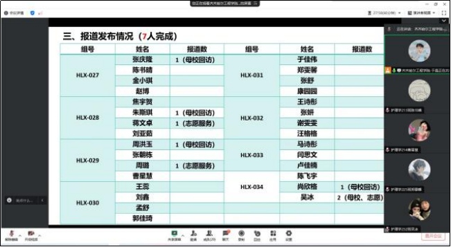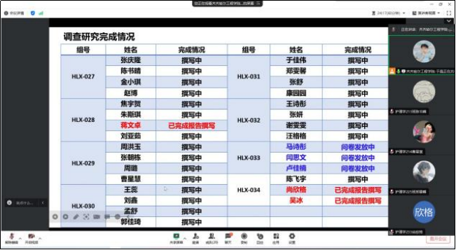 于晶老师还更正了一些作业的问题:如于佳伟和康园园同学“不忘初心、牢记使命”的截图上传的照片有误并进行了相应的指导。随后,对于项目作业“调研报告”进行进度调查,如:HLX-028组的蒋文卓与HLX-034组的尚欣格和吴冰均完成问卷报告的撰写,其他组仍在问卷发放或正在撰写的状态。生涯导师再次强调希望同学们能够在之后的社会实践学期中制定计划,有规律地完成项目作业。