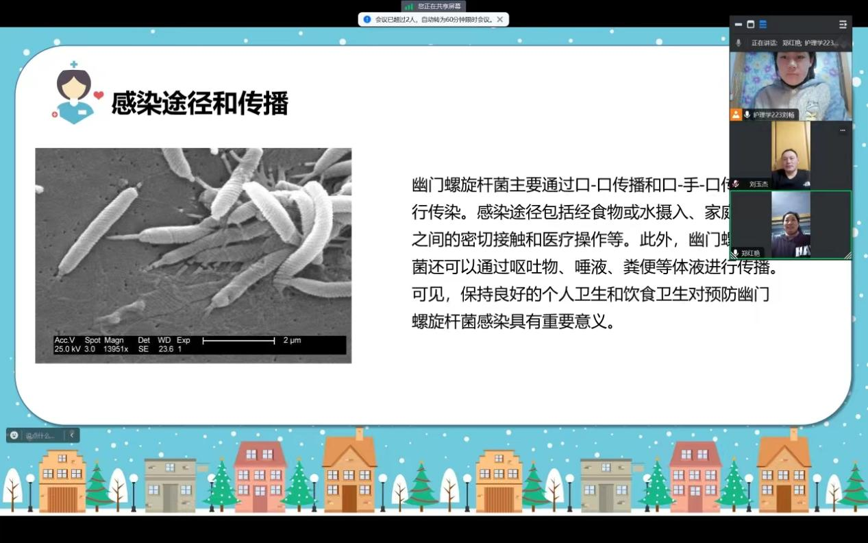 刘畅同学在社会实践学期进行了健康宣讲的志愿活动,通过腾讯会议的形式为小区里的人们进行宣传,主要进行一些细菌的传播途径和预防,已经感染后的症状,如何判断,并及时就医。也介绍了一些有关健康饮食,健康生活的习惯,通过这次志愿服务不仅帮助他们了解一些细菌的危害和感染症状,也培养了我们的语言组织能力。