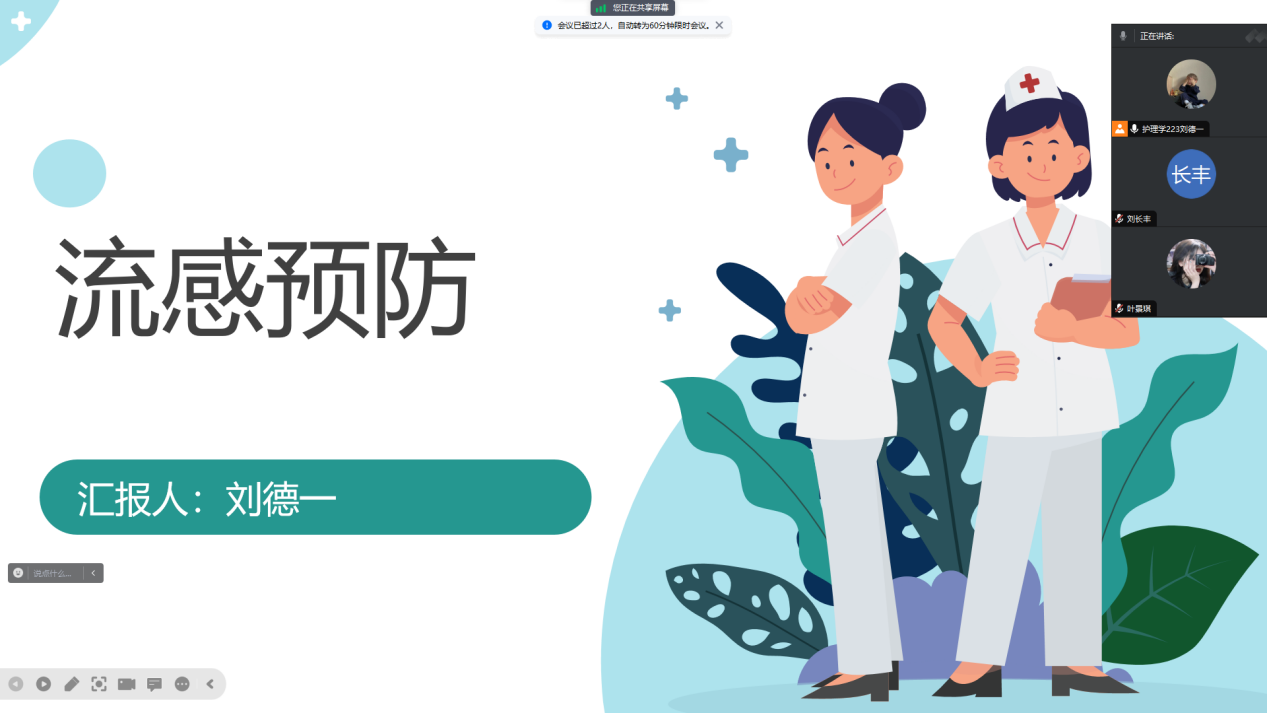 刘德一同学在社会实践学期进行了健康宣讲的志愿活动,通过腾讯会议的形式为社区里的老人进行宣讲如何预防流感,及其传播途径和主要症状以及缓解药物。作为一个志愿者,在助人的同时,也是自助。在使其他生命活出色彩的同时,可以从中得到思想上的升华,学会与人沟通,学会关爱他人,也更深刻地领会到生命的意义。而且,志愿者的活动,也为我提供了一个接触社会的机会,提供了一个锻炼自己的机会。