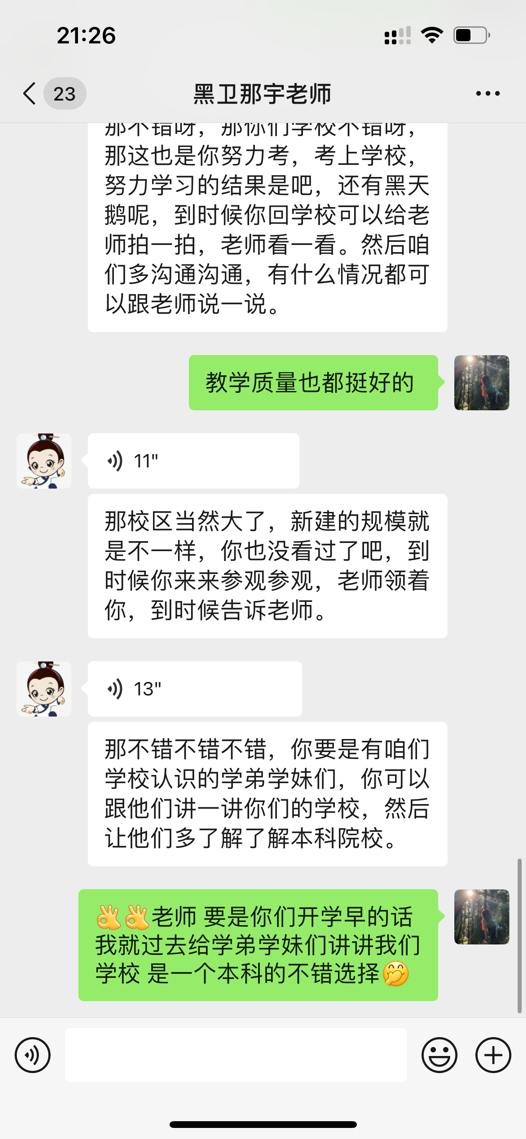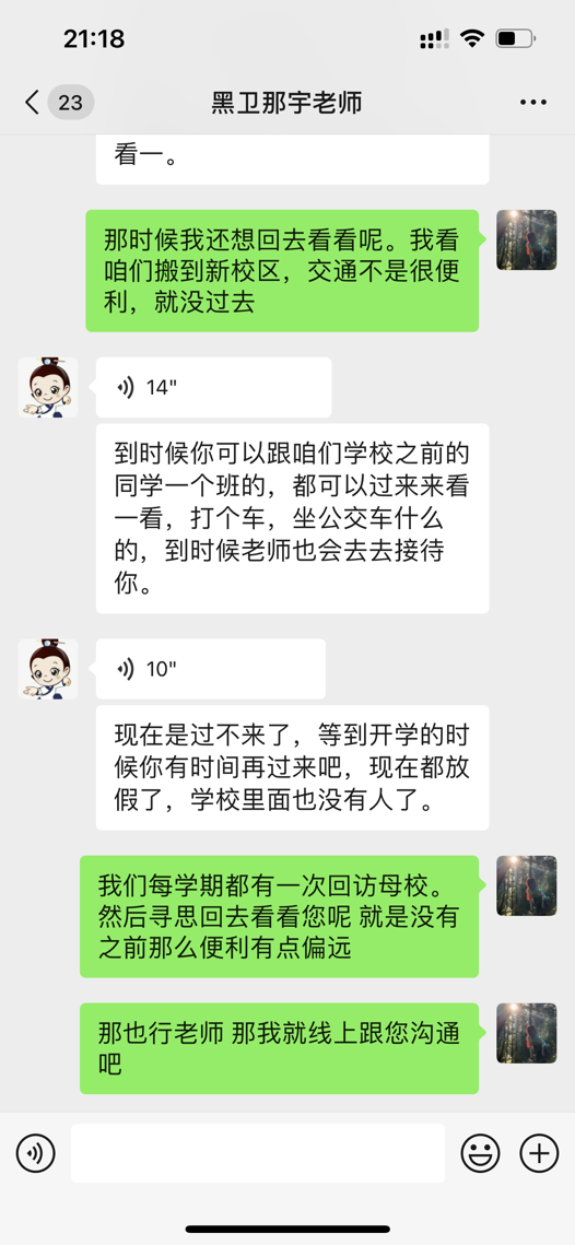 现已步入大学的校园,成为一名真正的大学生,感知了过去三年来一直憧憬的生活。在此次活动开始前,柴琦鹤同学联系了母校老师,由于学校已经进入休假阶段所以进行线上回访活动,与老师分享这一年多在大学的生活以及对专业的认知和未来就业的前景,开展学习经验交流,展现我校风采;并介绍齐齐哈尔工程学院的风貌,同时给予学弟学妹们一些学习的经验,并帮助他们解决学习上的困难,为以后的人生道路指引了一些方向,自此,本次母校回访圆满结束。