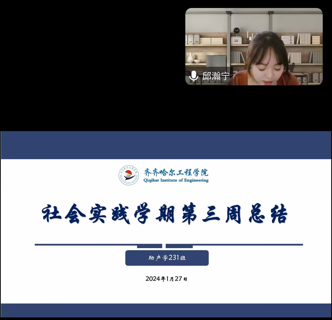 为了对同学们第三周社会实践进行总结,以及看各位同学社会实践的完成量,助产学231班在2024年1月27日以腾讯会议的形式组织开展“社会实践学期第三周总结”主题班会,本次会议由辅导员邱瀚宁老师主持召开,助产学231班全体生涯导师与全体同学共同参加。