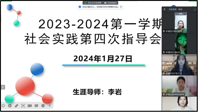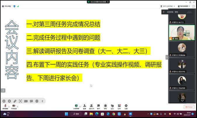 2024年1月27日为持续指导社会实践开展情况,学生完成情况,李岩老师在线上召开第四次社会实践指导会议,此会议由教师李岩主持,全体同学参加。本次会议旨在总结社会实践第三周任务的社会实践成果,规划下周实践任务,为提升学生的综合素质。