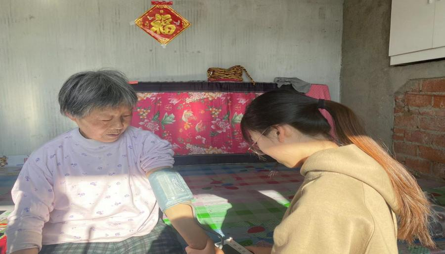 李晓宇在此次志愿服务中,在嫩江市白云乡麦海村为老人测量血压,测血糖,并进行健康宣教,告知老人们合理用药。