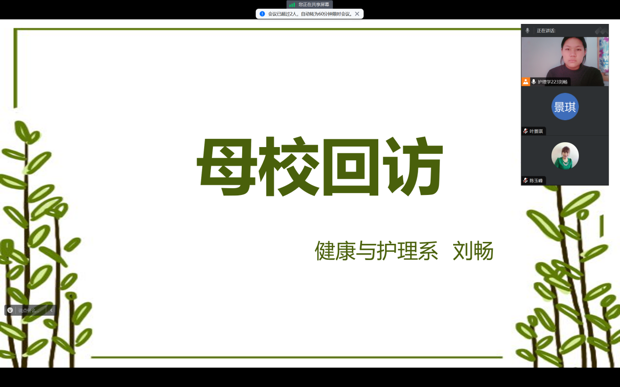 在社会实践学期,刘畅同学2024年1月24日在腾讯会议以线上的形式进行了母校回访的活动,以毕业生的身份为母校的学弟学妹提供了一些大学资讯,虽然我向他们讲授我认为行之有效的学习方法,但或许我们并没有信心做的比他们更好,我只是以过来人的身份,经历过高考洗礼,总结出的一些经验分享给他们,期望他们能在高考这道难题上给出更漂亮的解答。也为学弟学妹们介绍了我们学校的校园文化和学校的建设等。