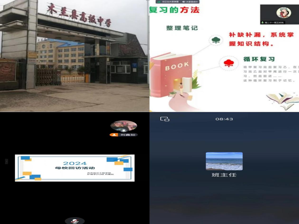 由于寒假放假以及其他不可抗力的因素,不能回到母校进行回访,HLX-138组杨志强、梁辰、刘鑫如、孙赫旋等四位同学经过商讨决定通过线上的方式来进行母校回访活动。非常遗憾不能回到母校,但是通过线上和老师交流的机会也了解到了学校的一些变化。