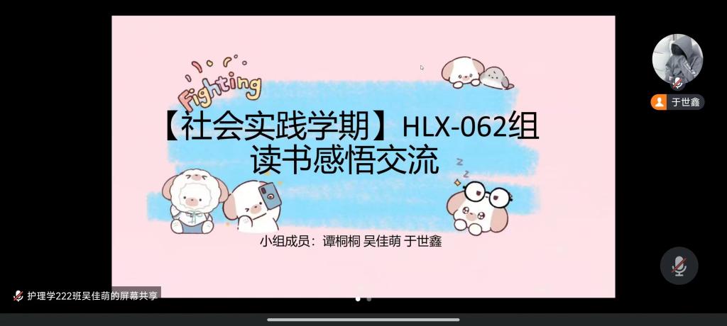 为了切实提高读书质量,展示读书成果,分享读书的收获,进一步深化“爱读书、读好书、勤读书”的理念,HLX-062组于2024年1月22日线上开展读书分享交流会,本次会议由于世鑫、谭桐桐、吴佳萌三名同学参加。