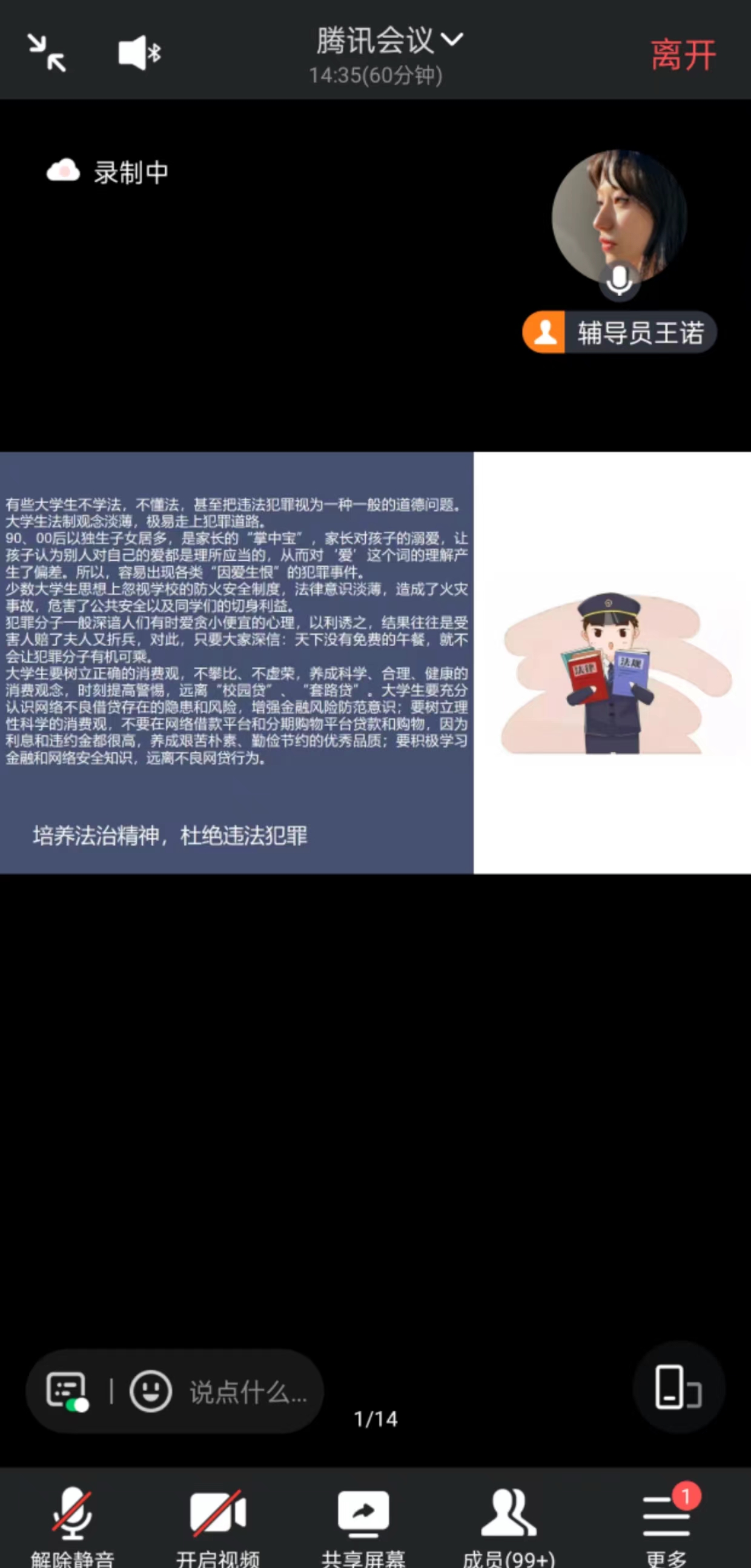 会议伊始,辅导员王诺通过PPT形式讲述一则有关90、00后大学生法制观念浅薄,走上犯罪道路的案例。其次重点强调大学生要树立正确的消费观,不攀比、不虚荣,养成科学、合理、健康的大学生要充分消费观念,时刻提高警惕,远离“校园贷”“套路贷”认识网络不良借贷存在的隐患和风险,增强金融风险防范意识;要树立理性科学的消费观,不要在网络借款平台和分期购物平台贷款和购物。最后提醒同学们年关将近各种“砍一刀、扫码领取现金”的活动谨慎参与,避免不法分子借此机会进行网络诈骗,套取信息。
