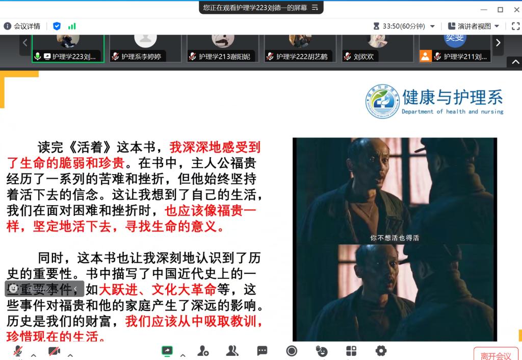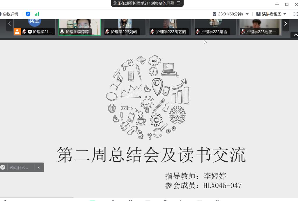 2024年1月20日,李婷婷老师采用腾讯会议召开第一次读书交流及第二周总结会,护理系HLX-045-047共三组成员参会。