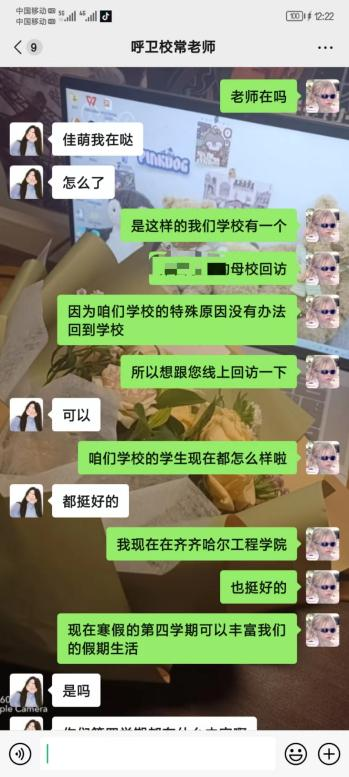 “师恩恰似三江水,一梦归流万里情”,为巩固师生情谊,表达自身对母校的感激之情,提升个人社会实践能力,HLX-062组成员吴佳萌同学组织开展母校回访活动,本次回访主要采用线上交流的方式进行。