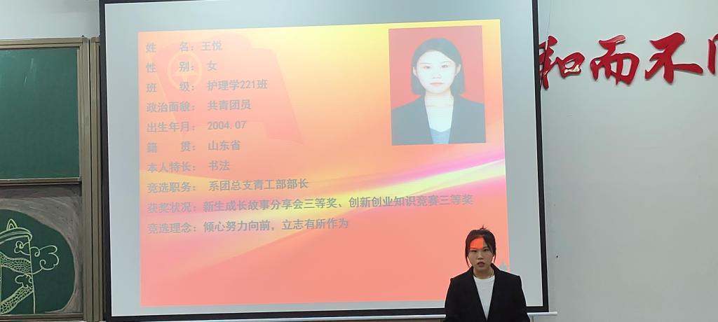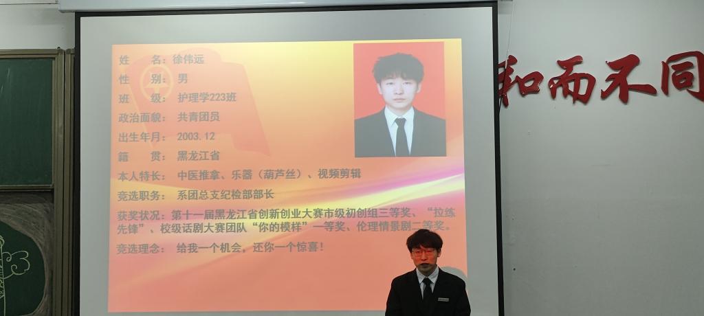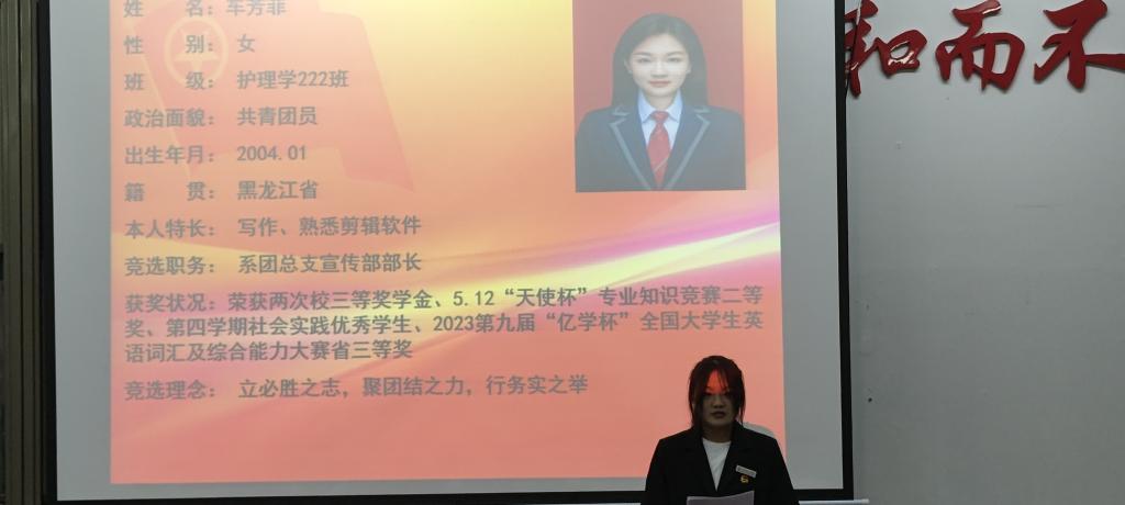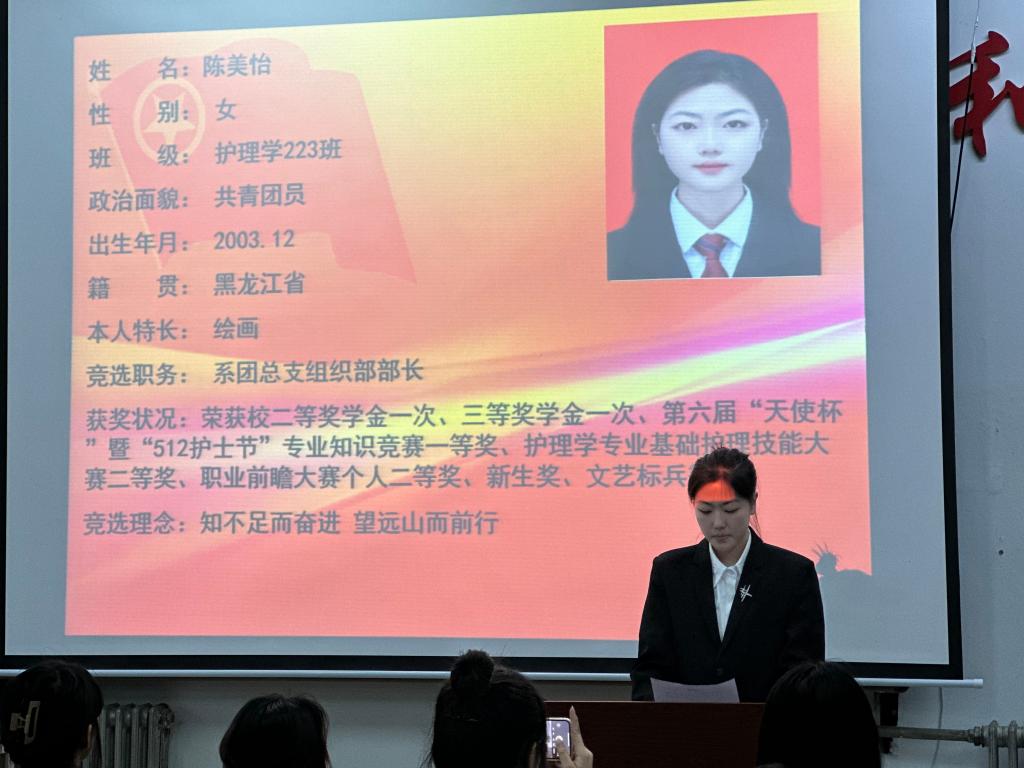 大会伊始,由健康与护理系学生会权益部部长刘德一向大家介绍大会流程。健康与护理系组织部部长李函豫宣读健康与护理系团总支干部候选人名单,健康与护理系宣传部部长陈书晴宣读换届会议监票人、计票人名单。随后,健康与护理系团总支干部竞选成员进行竞选演讲。由学生代表们进行现场投票。经计票,最终评选出新一届健康与护理系团总支干部,大会现场进行了投票结果的公示:第六届健康与护理系团总支副书记朱龙辉、健康与护理系团总支组织部部长陈美怡、健康与护理系团总支宣传部部长车芳菲、健康与护理系团总支青工部部长王悦、健康与护理系团总支纪检部部长徐伟远。