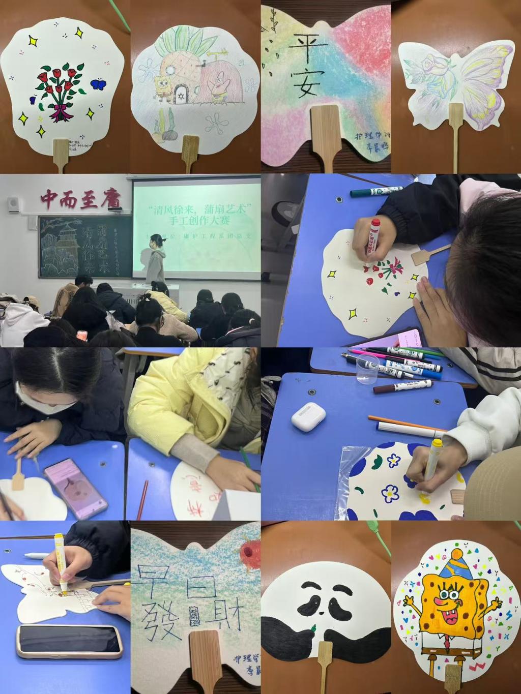 活动伊始,组织部部长陈美怡向同学们展示了几种的蒲扇绘制方法,包括色彩搭配、图案设计及笔触运用等让大家更详细了解蒲扇绘制。随后,大家拿起画笔,在空白的团扇上尽情描绘属于自己的艺术作品。同学们轻松掌握了手绘技巧,画法逐渐娴熟。同学们根据自己的创意和想象力,利用水彩笔、颜料等在空白的扇面上,尽情勾勒,笔触细腻,色彩鲜艳。在同学们的精心制作下,一面面独特的扇面展现在大家眼前。活动最后,根据作品的色彩搭配、图案设计等方面评选出一等奖一名,二等奖两名,三等奖三名。