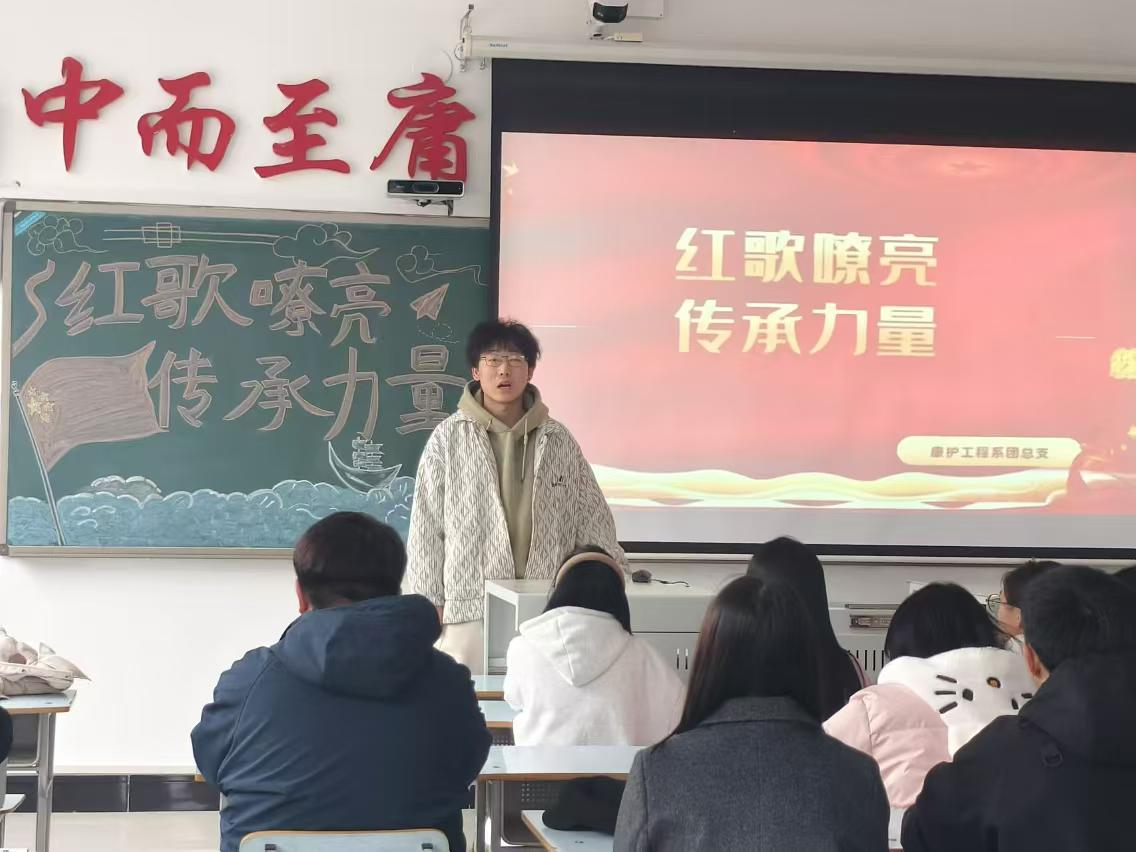 为了传承红色基因,激发爱国热情。康护工程系团总支于11月9日在1#1201开展“红歌嘹亮,传承力量”主题活动,活动由纪检部部长徐伟远主持,共85位同学参加。