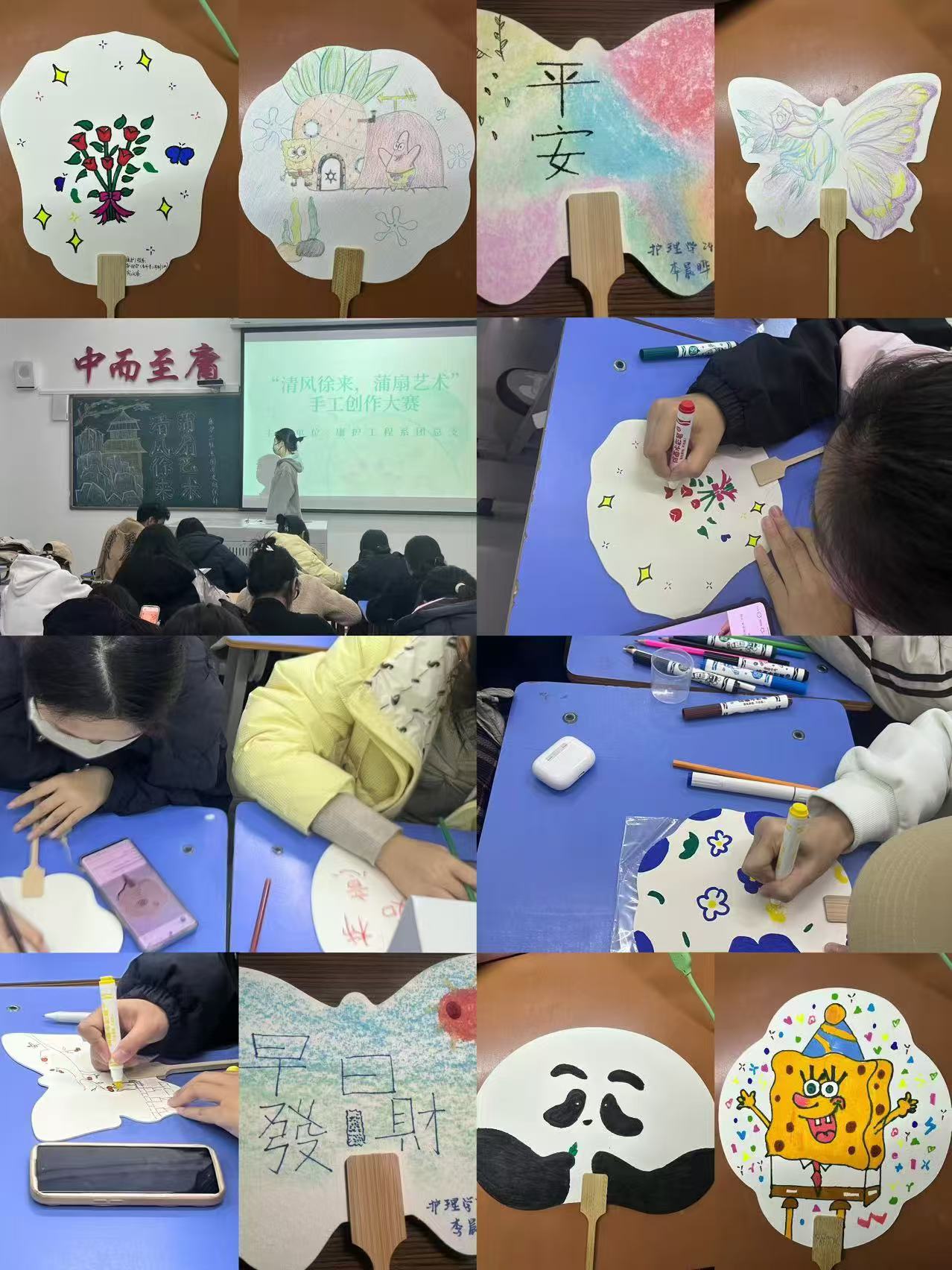 活动伊始,组织部部长陈美怡向同学们展示了几种的蒲扇绘制方法,包括色彩搭配、图案设计及笔触运用等让大家更详细了解蒲扇绘制。随后,大家拿起画笔,在空白的团扇上尽情描绘属于自己的艺术作品。同学们轻松掌握了手绘技巧,画法逐渐娴熟。同学们根据自己的创意和想象力,利用水彩笔、颜料等在空白的扇面上,尽情勾勒,笔触细腻,色彩鲜艳。在同学们的精心制作下,一面面独特的扇面展现在大家眼前。活动最后,评委们依照评分标准,秉持着公平公正的原则进行打分。根据作品的创意性、色彩搭配、图案设计、主题表现等方面评选出一等奖一名,二等奖两名,三等奖三名。