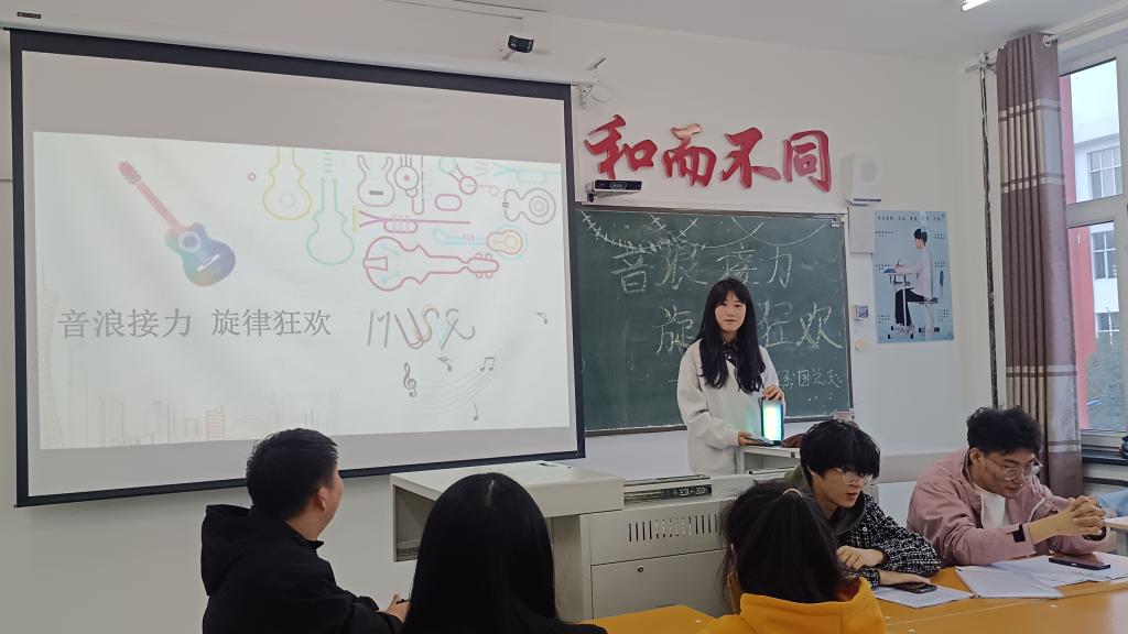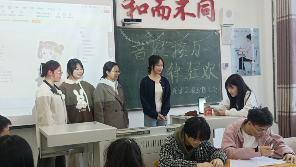 为丰富同学们的课余生活,锻炼逻辑思维与反应能力,康护工程系团总支于4月24日在一号教学区1202教室组织开展“音浪接力,旋律狂欢”主题活动,活动由纪检部部长柳秋茹组织、石鸿维主持,康护工程系51名同学参加。