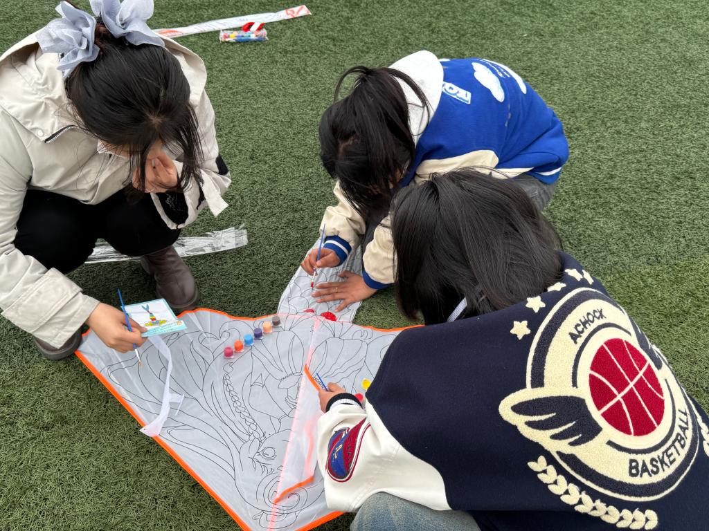 比赛开始前,工作人员给同学们讲解了比赛规则和安全注意事项。这次比赛既要看风筝飞得高不高、稳不稳,也要看风筝的外观设计好不好。紧接着同学们以小组为单位参赛,同学们现场给风筝涂色,用画笔为风筝添上绚丽的图案,让它们在空中更具辨识度。接下来同学们分工合作,有人负责拿风筝,有人负责牵线,有人帮忙观察风向。随着一声令下,同学们就跑起来放风筝,一只只风筝慢慢升上天空。有的风筝很快就飞得很高,稳稳地飘在空中;有的一开始飞得不太顺利,在低空来回晃动,小组成员赶紧调整,让风筝越飞越高。比赛过程中,现场特别热闹,加油声不断。没参赛的同学在旁边为大家加油,参赛的同学也互相交流经验,一起想办法把风筝放得更好。
