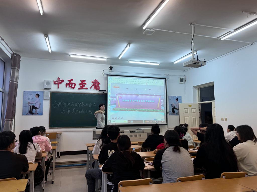 活动伊始,王佳爽向同学们介绍了此次活动的目的与意义,强调党的语言文字事业在不同历史时期的重要作用,激发了大家的学习兴趣。随后,同学们通过中国语言文字数字博物馆的链接,沉浸式参观《党的语言文字事业百年光辉历程展》。王佳爽结合展览内容,为大家生动讲解党的语言文字事业从初创到发展壮大的百年历程,包括语言文字在党的革命、建设和改革等阶段所承载的使命与发挥的力量。活动过程中,同学们专注聆听、积极互动,都全身心投入到对党的语言文字事业发展历程的学习中。同时,此次活动也为学校语言文字工作高质量发展注入了新活力,有助于在校园内进一步营造重视语言文字、传承语言文化的良好氛围,推动学校语言文字事业不断迈上新台阶。