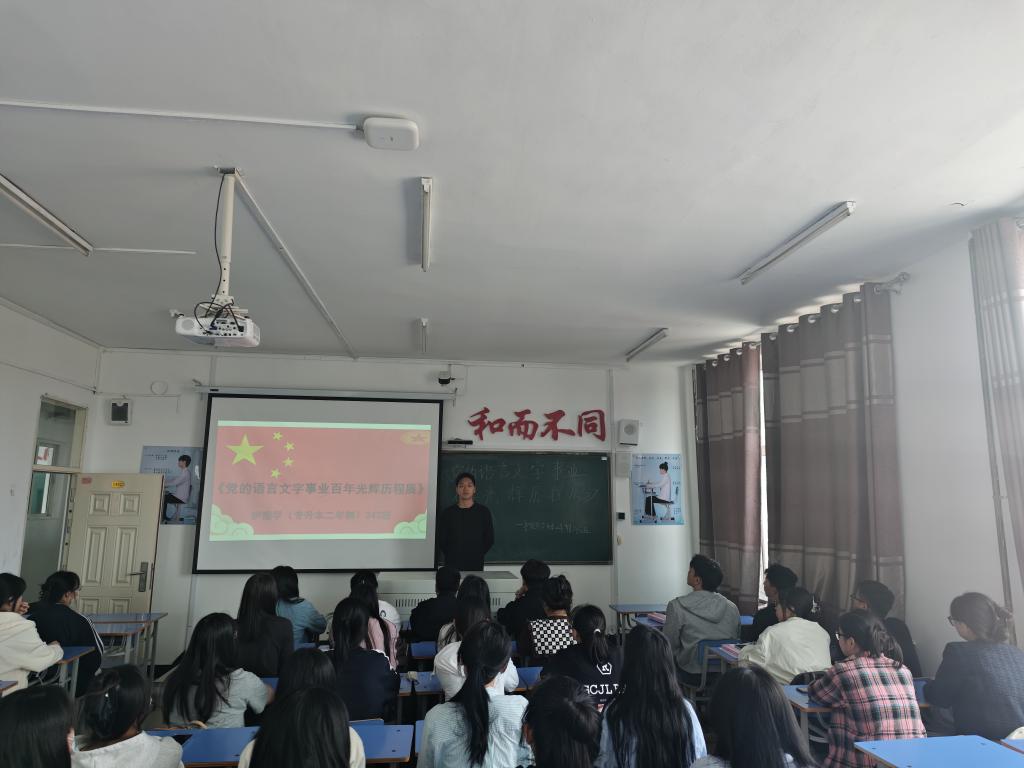为了深化同学们对党的语言文字事业发展历程的认知,厚植文化自信与民族自豪感。护理学(专升本二年制)243班于9月10日在一号教学区1302教室组织开展《党的语言文字事业百年光辉历程展》主题团日活动。本次活动由学校语委会主办,由团支书赵博主持,护理学(专升本二年制)243班全体同学参加。
