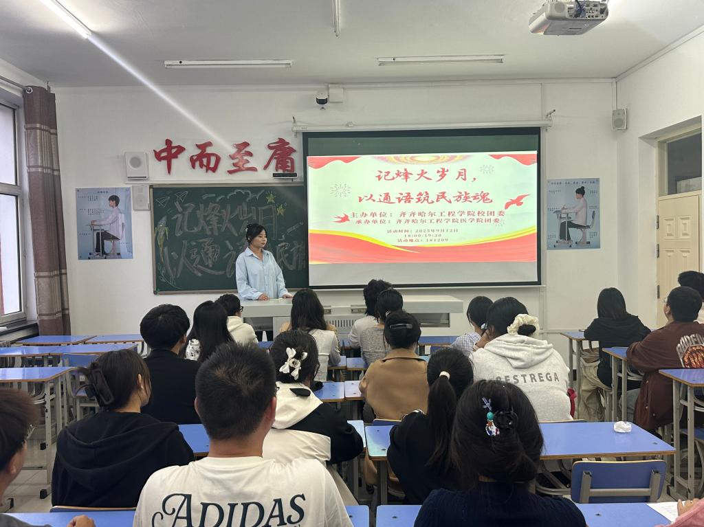 为进一步深化对九一八事变重大历史事件的铭记,同时落实国家推广通用语言文字的要求,医学院团委于9月12日在一号教学区1209教室组织开展“记烽火岁月,以通语筑民族魂”主题活动,活动由青工部部长祝宇昕主持,医学院40名同学参加。