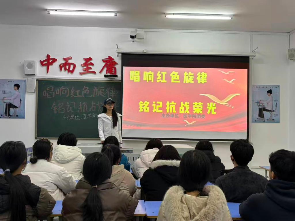 为激发青年学子的民族自豪感,强化价值引领,医学院团委于11月14日在一教1209教室举办“唱响红色旋律,铭记抗战荣光”主题活动,本次活动由纪检部部长柳秋茹组织,共50人参与。