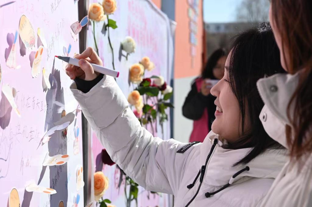 活动伊始,团委的志愿者们将现场布置温馨雅致,吸引众多师生驻足参与。在志愿者的引导下,同学们纷纷在便签上写下对女性同胞的真诚祝福,内容或温暖、或励志、或幽默,字里行间洋溢着对女性力量与美丽的由衷赞美。随后,团委的志愿者们将一朵朵象征着尊重与祝福的鲜花,连同写满心意的便签,亲手送到过往女生及女教师手中。每一份礼物背后,都是一次温暖的对话,一份被看见的感动。活动现场气氛热烈而温馨,同学们纷纷表示,这样的活动不仅让她们感受到了节日的仪式感,更增强了自我认同与自信。