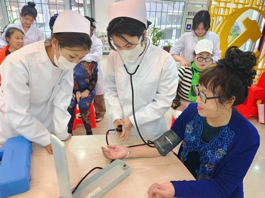 活动伊始,在团总支书记邱瀚宁的组织下,师生志愿者们早早抵达新化社区,并在现场统筹协调,快速完成健康义诊、康复理疗、健康知识科普等多个服务区域的布置。随着居民陆续到来,护理专业的学生志愿者们有条不紊地为居民测量血压、血糖,记录检测数据,同时耐心解答居民关于常见疾病预防和治疗的疑问,活动迅速有序开展。