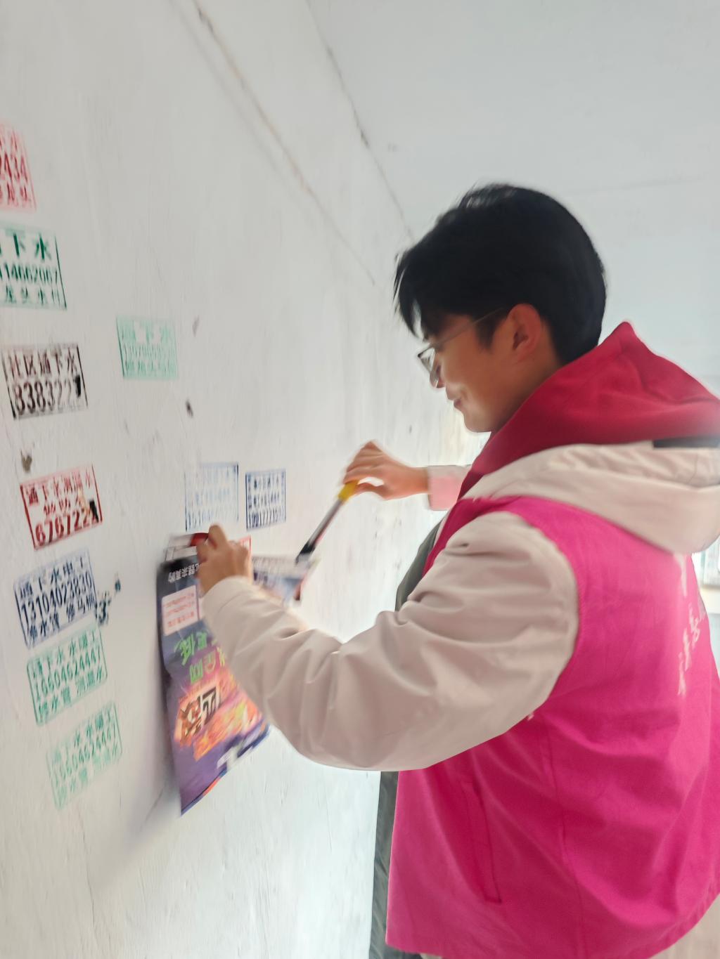 在活动现场,为解决独居老人行动不便、无力清扫楼道等难题,学生志愿者们开展“楼道焕新”行动,带着扫帚、拖把和消毒工具走进社区,为独居老人所住的楼栋,开始清理楼道杂物、擦拭公共设施。打扫干净后学生志愿者们还特意在每层楼道张贴“禁止堆放杂物”的温馨提示,确保楼道长期保持整洁,用整洁的环境为老人筑牢居家安全防线。