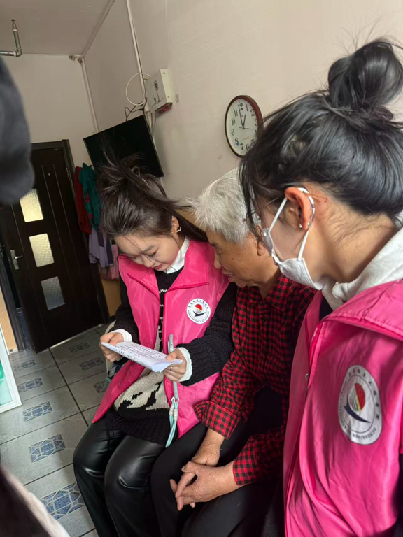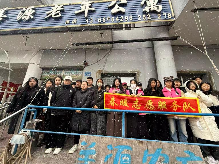 活动现场,志愿者们与老人们围坐畅谈。他们耐心地听老人们回忆往昔岁月,分享生活中的点滴故事,时而为老人们的人生阅历赞叹,时而与老人们一同开怀大笑。这种近距离的交流,不仅让老人们感受到被关注的温暖,也让志愿者们在倾听中对老一辈的生活有了更深刻的理解。志愿者们展现出了十足的细心与耐心。看到行动不便的老人,他们主动上前搀扶。活动尾声,志愿者团队在敬老院前合影留念,鲜红的队旗与志愿者们的笑容交相辉映,定格下这充满意义的一刻。