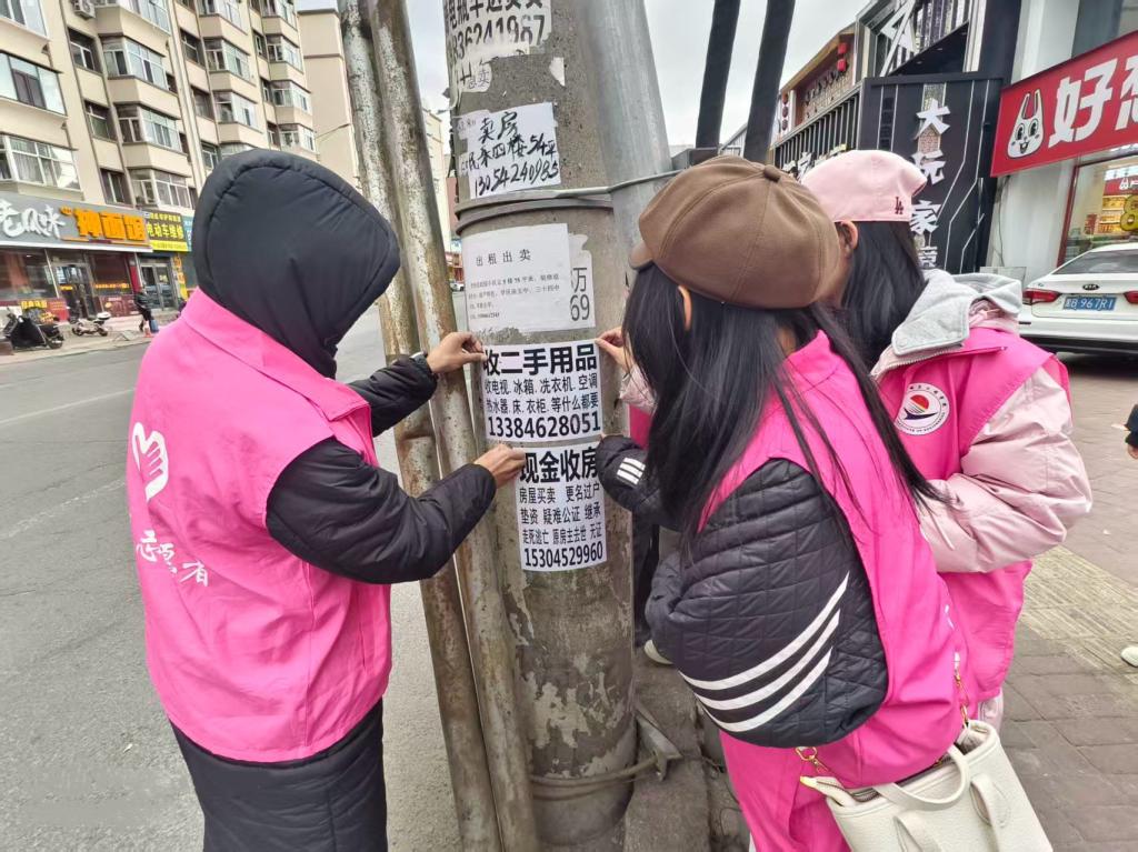 活动中,同学们携带清洁工具,一场分工明确、协作紧密的环境整治行动正式拉开序幕。社区整治中,同学们们分为三个小组高效协作:广告清理组手持铲刀、喷壶,逐栋清理楼道及墙面的非法小广告;卫生清扫组携带工具,对社区道路、绿化带内的生活垃圾、落叶进行全面清扫;物品规整组则将公共区域散乱的休闲设施等逐一归位。大家相互配合,干劲十足,很快让社区变整洁,使环境得到了明显的改善。