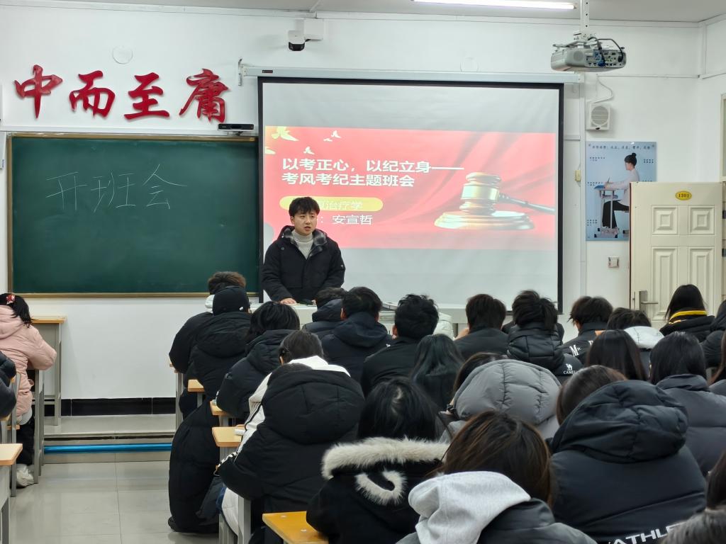 为强化学生诚信考试意识,营造公平公正的考试氛围,近日,康复251班在一号教学楼1301教室教室召开考风考纪专题班会。班会由安宣哲老师主持,全体同学参会。