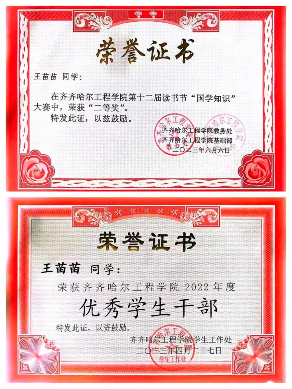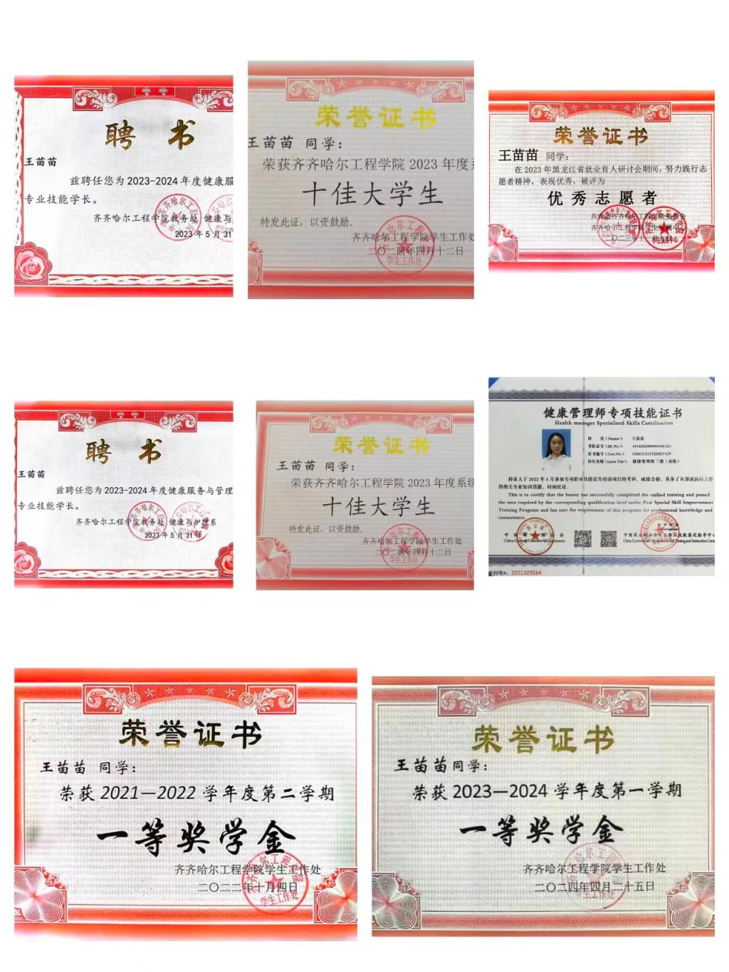 王苗苗积极参与各类专业竞赛,并取得优异成绩:荣获2022-2023学年度“中国居民膳食指南宣讲技能大赛”团体一等奖、第十二届读书节“国学知识”大赛二等奖以及“中医康养企业案例分析大赛”团体一等奖等诸多荣誉。