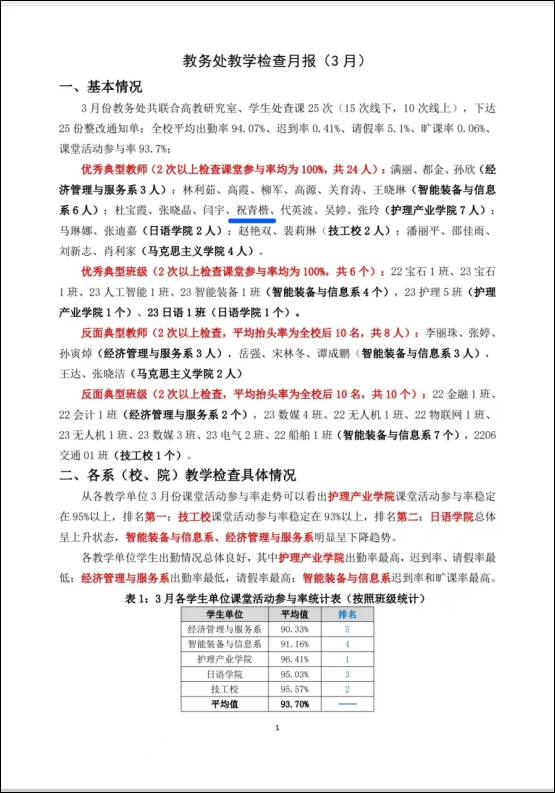 2024年4月2日,在学校教务处教学检查月报(3月)被评为护理产业学院优秀典型教师。