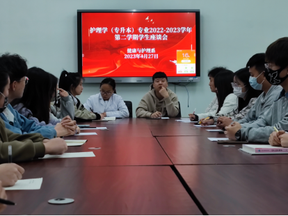 427晚健康与护理系护理学(专升本)专业召开2022-2023学年第二学期学生座谈会,专业负责人单大海、辅导员米新、专业助理苏森森及各班推选代表参加此次座谈会。主讲人专业负责人单大海。