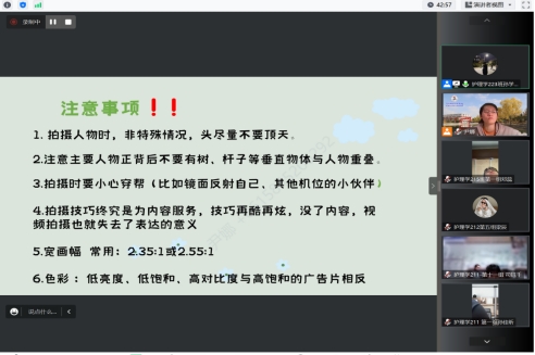 孙学松同学先以获奖短视频为例,从成员分工、拍摄设备、剧本选景、剪辑制作四个方面逐一进行了讲解,其中对于重点掌握的内容进行了详细的说明,借助视频展示多个镜头剪辑出一个片段,让作品更加地富有层次感。强调了再炫酷的特效也是为内容所服务,同学们在编制剧本时应注重内涵,强调短视频本身弘扬的正能量,通过最后的注意事项提示同学们在拍摄的过程中容易忽视的小细节。
