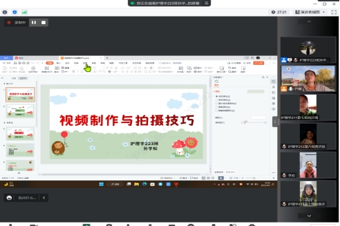 首先由尹娜老师讲解了本次培训会的目的,为了更好地应用《护理伦理学》相关的基本原理、观点、原则和规范解决临床中护理伦理难题,提升学生的职业道德修养,要求根据临床案例改编剧本,拍摄护理伦理情景剧短视频作为课前预习任务,并依托课程举办《护理伦理情景剧短视频大赛》,为了能够让同学们掌握更多关于视频制作与拍摄时的技巧,提升同学们的数字应用能力,特别邀请了曾经获奖的同学进行经验分享。