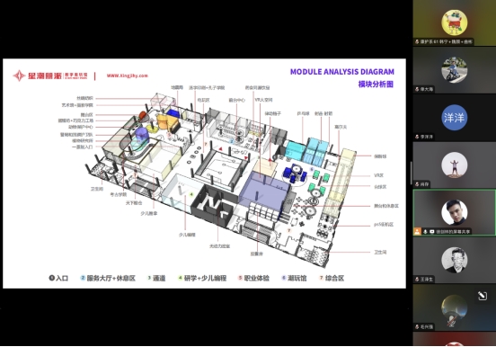 会议开始,由项目设计经理徐剑林介绍了知甘堂4F方案,亮点包括职业体验区,模拟真实场景让孩子体验医生、消防员等职业,增强职业认知;潮玩区集VR设备、互动游戏于一体,提供娱乐挑战;少儿编程区与研学区域通过互动课程和实验装置,培养逻辑思维、编程技能及科学兴趣;健康管理中心提供绿色疗法,改善儿童健康状况。