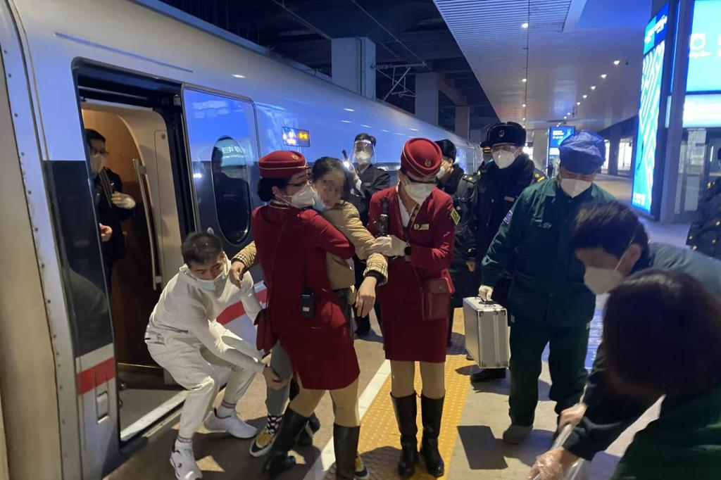 当晚约20时,列车行至高邑西站时,一名女性乘客突感不适并出现呼吸困难。乘务人员通过广播紧急寻找医务工作者。师瑞生同学意识到情况紧急,迅速前往救助。他疏散了周围人群,为其创造了一个较为安静的环境。通过询问,得知其曾患有呼吸性碱中毒,师瑞生同学指导其解开衣物拉链,保持呼吸道畅通,并使用纸袋进行深呼吸,以增加血液中的二氧化碳浓度,帮助恢复酸碱平衡。在另一位学长的协助下,师瑞生为乘客测量了血压和体温,确认生命体征稳定。经过一段时间的二氧化碳再吸入法处理,该名乘客的面色逐渐好转,不再颤抖,手指活动也恢复正常。在乘客坚持到站期间,师瑞生一直陪伴在她身边,直至专业医疗急救人员到来,将乘客接走以进一步检查和治疗。回到座位后,车厢内的乘客们纷纷向他投以赞许的目光。