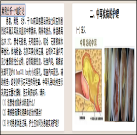 3.考核方法:课后进行角色扮演,将案例中的角色进行小组分配,将护理诊断及护理措施进行梳理,学生模拟病例演练,录制视频。通过角色演练使学生能够真实表达案例情景,熟练掌握护理方法,提升学生语言表达能力及沟通能力。